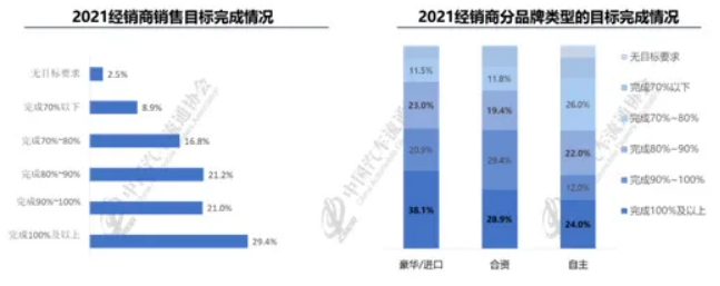 调查显示,2021年有三成经销商完成销量目标,七成经销商完成了全年任务指标的80%以上。分品牌来看,豪华/进口品牌经销商年度目标完成情况较好,近四成经销商完成全年销售目标。