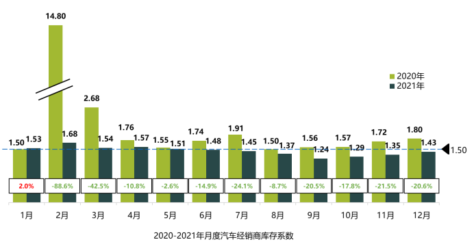 近年来,随着中国车市增速放缓,经销商压力越来越大,库存预警指数居高不下。2021年受芯片短缺影响,车企产能受限,新车供应不足,这客观上帮助经销商消化了库存。从下图可以看出,2021年单月库存系数相较2020年下降明显。尽管芯片短缺问题在第四季度缓解,经销商积极备库使库存水平回升,但不及往年,处于近三年的历史低位。