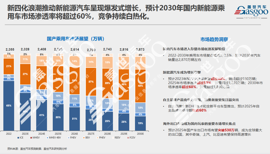 经历了疫情三年,中国经济发展仍呈现出一定的韧性。聚焦到车市来看,2022年,我国汽车工业呈现恢复性增长,全年产销量稳中有增,目前,中国车市已经进入了相对成熟的阶段,2022-2030年乘用车市场复合增速为2.5%,预计2030年汽车销量达2,870万辆左右。在基本盘微增的情况下,新能源将成为核心增长引擎。探车虫洞研究院预计,2030年新能源市场渗透率将超过60%,车市竞争会持续白热化。