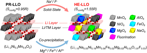 高熵氧化物(HEO)因其稳定的固态相和成分灵活性而成为锂离子电池(LIB)的有前途的阴极材料。此次研究的是新型非等摩尔高熵阴极材料的结构和电化学性质,又称为高熵富锂层状氧化物(HE-LLO,Li1.15Na0.05Ni0.19Mn0.56Fe0.02Mg0.02Al0.02O1.97F0.03),并与原始富锂层状氧化物(PR-LLO,Li1.2Ni0.2Mn0.6O2)进行了比较。将多种阳离子(Na+、Al3+、Mg2+、Fe3+)和阴离子(F−)掺入HE-LLO中可引入成分多样性,通过熵稳定效应增强结构稳定性。