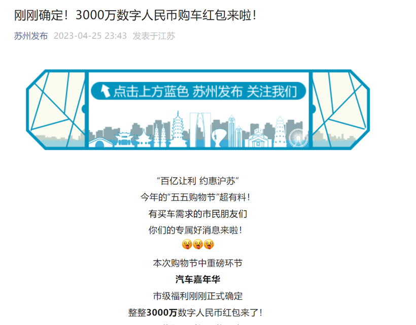 在发布该消息的同一日,苏州发布还宣布了在本次购物节的汽车嘉年华主题活动中,太仓市、相城区、苏州高新区等板块发放购车补贴,购车即可领取一定金额的数币红包。通过开展“春日试驾会”“春日绿色购车节”“春日线上推介会”“春日油品消费节”等400余场活动,全市超两百家车企参与,联袂推出现金优惠、置换补贴、免息贷款、豪华礼包等综合优惠措施,累计让利超15亿元。