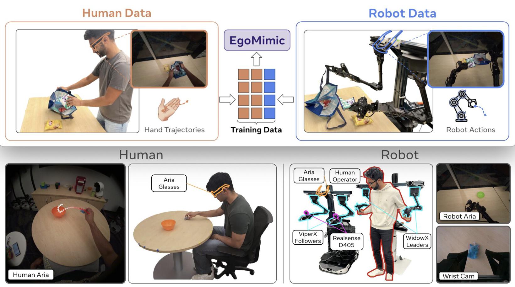 “EgoMimic通过以下方式实现这一目标:(1)使用符合人体工程学的Project Aria眼镜捕捉人体化身数据的系统,(2)低成本双手操纵器,可最大限度地缩小与人体数据的运动学差距,(3)跨域数据对齐技术,以及(4)模仿学习架构,可对人类和机器人数据进行共同训练。”