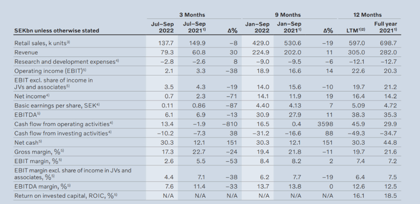 探车虫洞讯 10月27日,瑞典汽车制造商沃尔沃汽车公布了第三季度财报,营收同比上涨30%至793亿瑞典克朗,营业利润(不包括合资公司和联营公司)为35亿瑞典克朗,较去年同期下降19%,销量下降、原材料成本上升、为填补生产缺口而购买半导体现货以及物流成本上升,都是导致营业利润下降的原因;利润率为4.4%;净利润为7亿瑞典克朗,而去年同期为23亿瑞典克朗。沃尔沃的业绩反映了全球汽车行业面临的多重阻力。