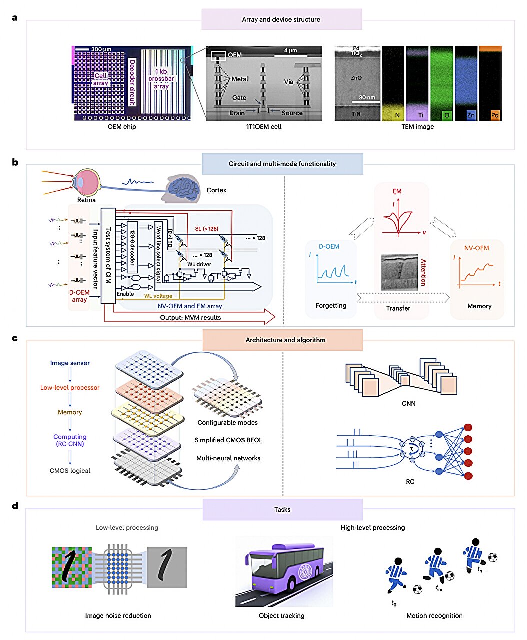 研究人员展示的设备利用电和光同时处理信息和存储数据,这对于传感器内计算应用至关重要。OEM具有分层结构,各种材料(Pd/TiOx/ZnO/TiN)相互叠放。