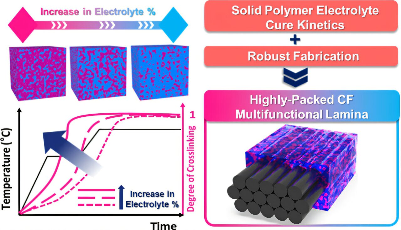 为了克服这些挑战,Kim教授团队探索了“储能复合材料”的概念,重点关注界面和固化性能,这在传统复合材料设计中至关重要。这导致了高密度多功能结构碳纤维复合电池的开发,可最大限度地发挥多功能性。
